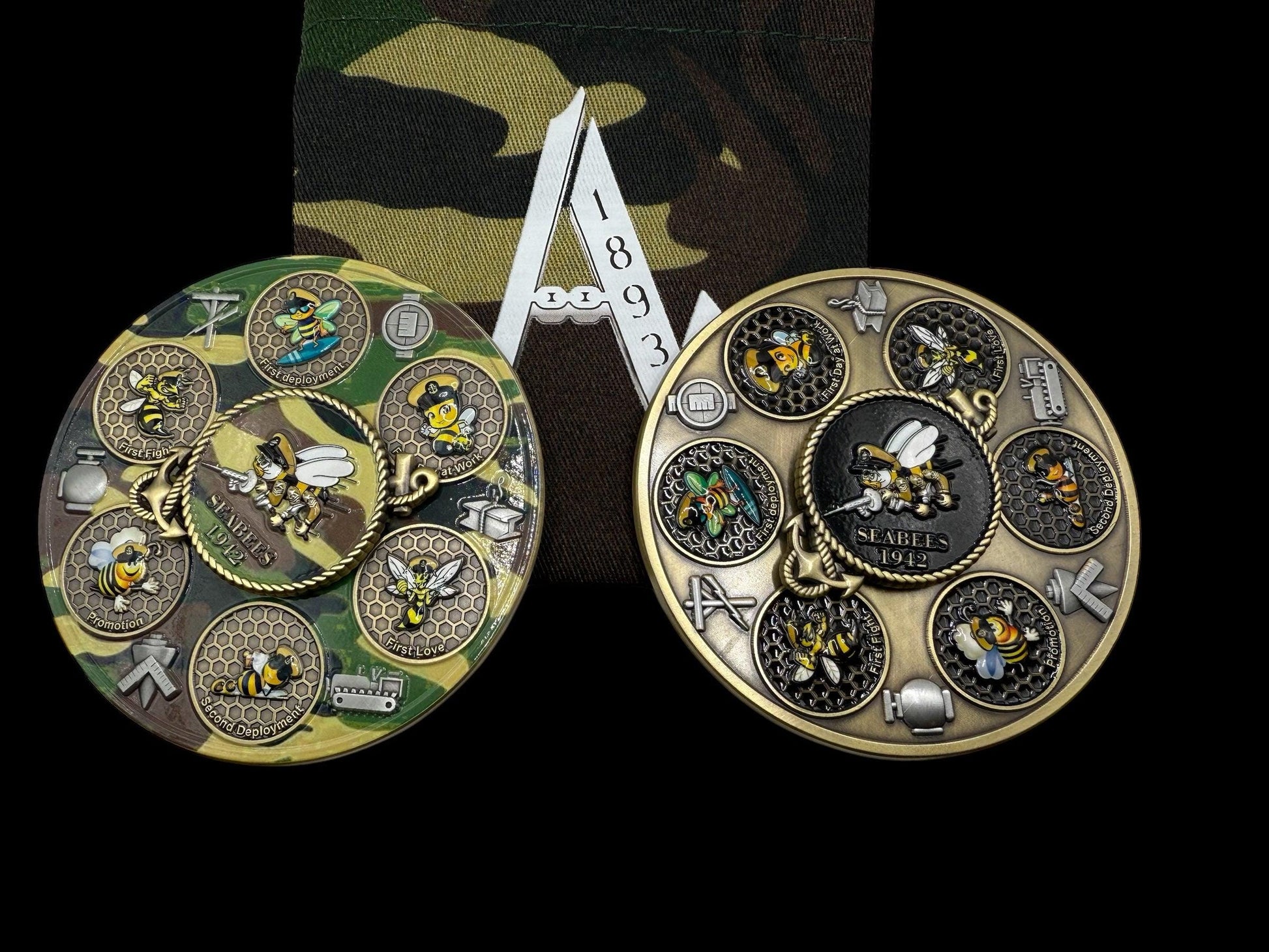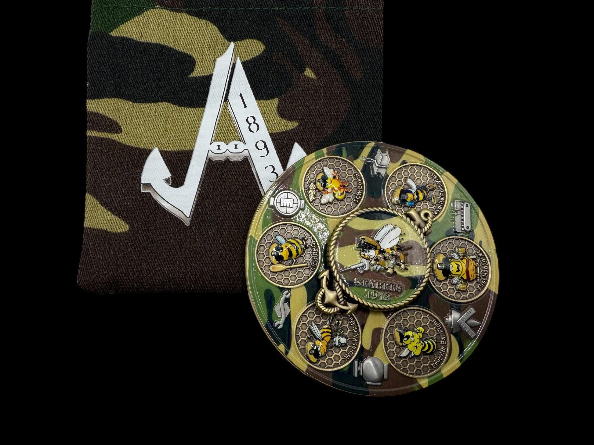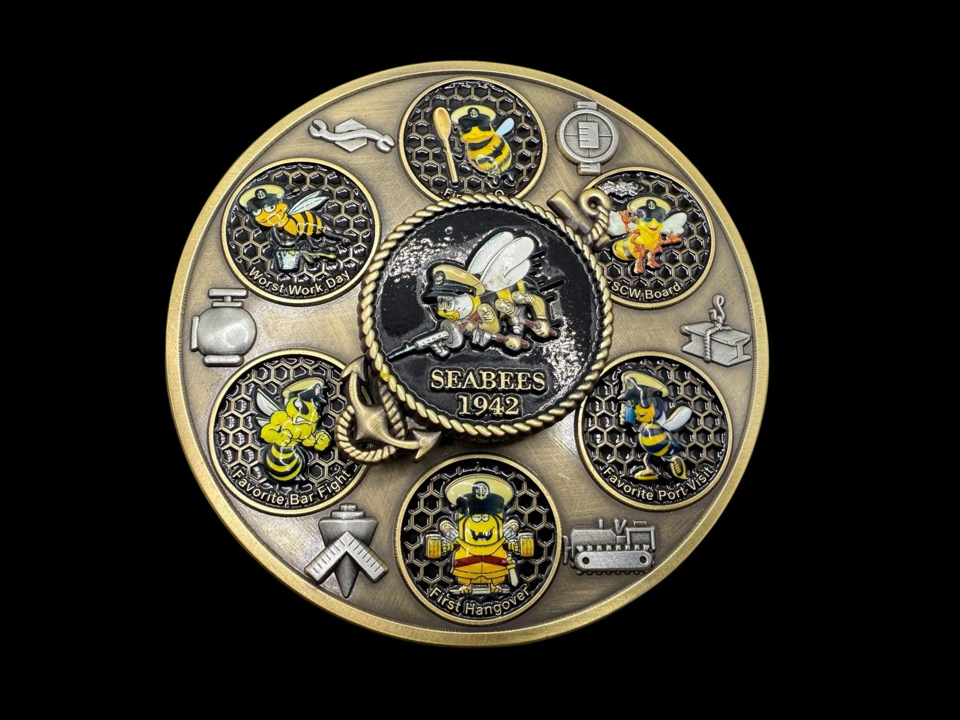 3.5 spinner , 6.6 oz in weight only one color in Antique Gold. Seabee's Life , find a Seabee and have them spin the wheel and they must tell you a story once landing on the picture.